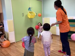 壁につけたカゴに向かって『風船いれ』に挑戦します‼️