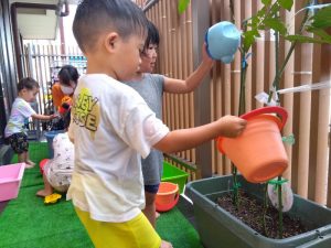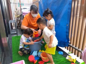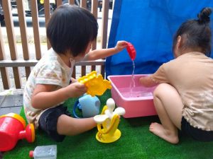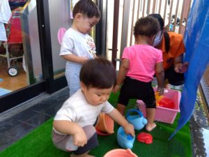水遊びが始まりましたが、体調を考慮して保護者様と相談させていただき