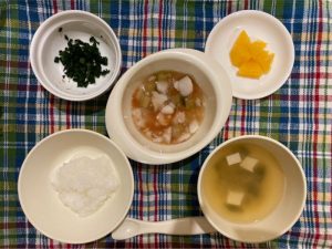 粥 味噌汁 白身魚のトマト煮 小松菜のつぶし煮 オレンジ