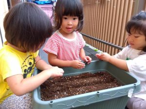 赤い種を触ったり匂いをかいで観察した後、種をつまんでパラパラと土の上に蒔きました👏