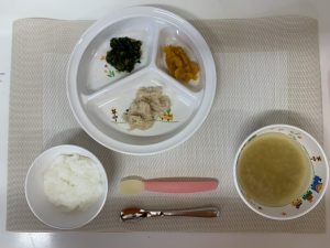 粥 味噌汁(玉ねぎ・さつまいも) 煮魚(たら) 小松菜のだし煮 かぼちゃの甘煮