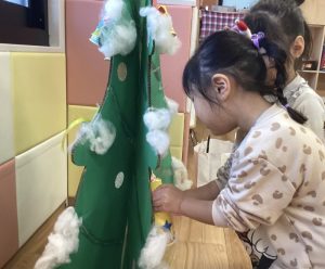 だんだんクリスマスツリーが大きくなっていく様子を見て「大きい!」「くまさんいた!」と