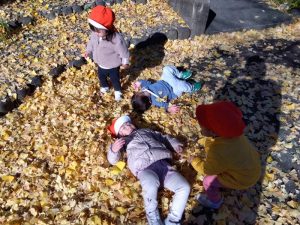 横になったお友達に落ち葉を優しくかけてあげる姿もありましたよ💓