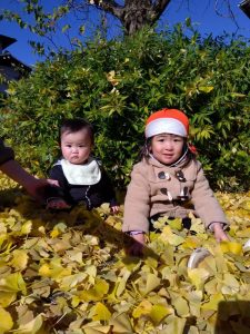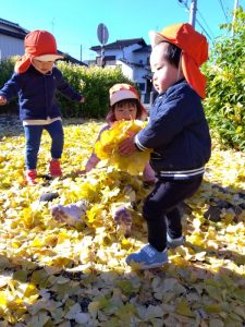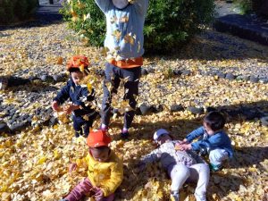 近所の公園ではイチョウが落葉し、たくさんの落ち葉で遊ぶ子どもたちの姿がありました😊