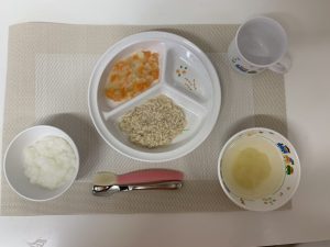(写真は普通食になります。年齢によって盛り付け量を変えて、提供しています。)