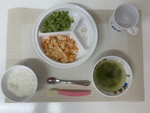 粥 味噌汁(小松菜・豆腐) 魚と人参の煮物 ブロッコリー柔らか煮