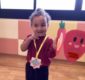 お名前を呼ばれて保育士からメダルとカードを受け取ったお友だち😊