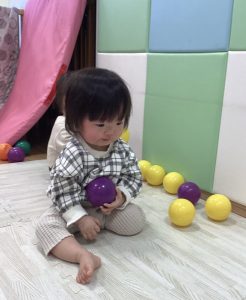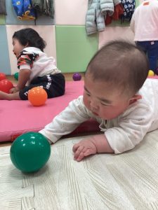 近くのボールに一生懸命手を伸ばすもも組のお友だち💓