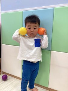 いちご組のお友だちもボールを手に取り、投げたり転がしたりしながら
