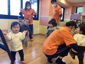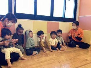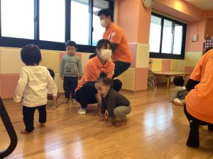保育士の真似をして一緒にカエルやお馬を表現しながら歌いました🙌