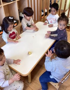 いちご組さんは机の上に転がしてみたり、叩いて硬さを感じてみてました🌷