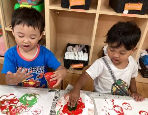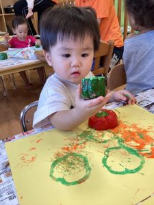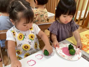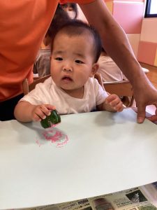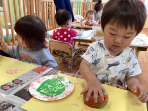 もも組のお友だちも、保育士と一緒にペッタン🌟
