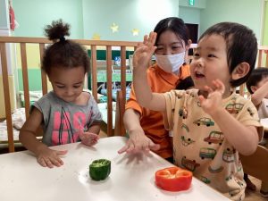 切ったピーマンやパプリカで野菜スタンプをしました⭕️
