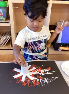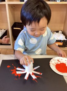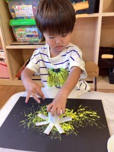 夜空に見立てた黒い画用紙に、スタンプで花火を表現しました🎆