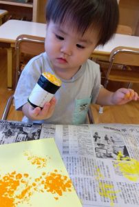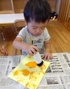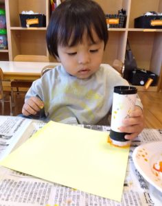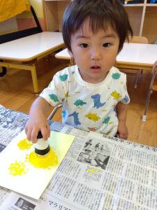 スタンプをしっかり持って、絵の具がつくかな…❓