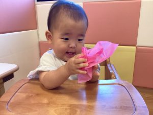 黄色と桃色のおはながみを見せると、ピンクの方に手を伸ばしたお友だち💕