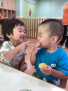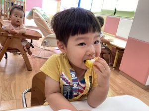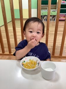 向き終わったとうもろこしは、りんご組さんが調理さんに「お願いします!」と渡して、おやつにみんなで仲良く食べました🌽😄
