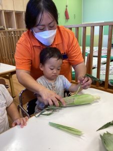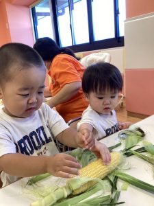 もも組さんはもとうもろこしの皮に触れてみたり、保育士と一緒にむいてみたりしました✨