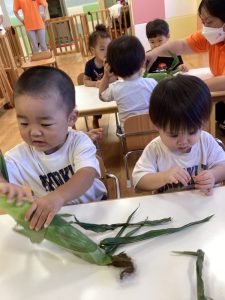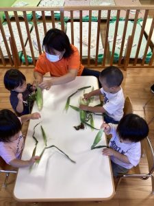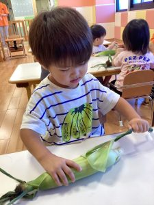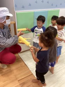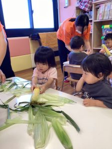 水遊びも引き続き楽しんでいる子どもたちですが、今月は夏の野菜「とうもろこし」の皮むきを行いました。