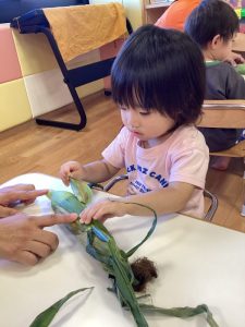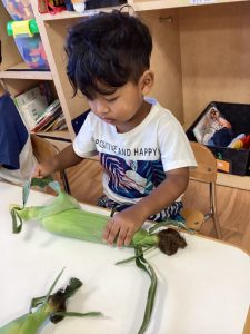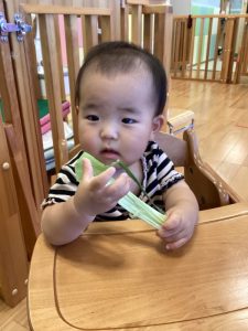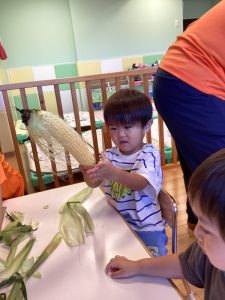 皮のついているとうもろこしをじーっとよく見て、保育士のお話しもしっかりと聞いていました♪