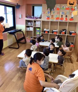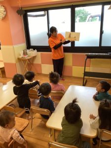お話しが始まると何が始まるのだろうとワクワクした様子で、目を輝かせて絵本に集中していました。隠れている動物が何かな?と考えてわかると嬉しそうな表情を見せてくれました😊