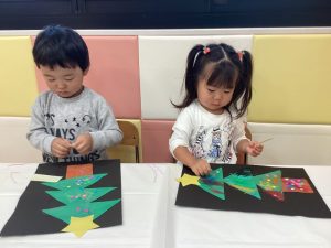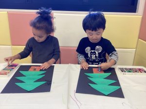 園でも玄関にツリーを飾っていたので、「ツリーつくる❗️」とやる気満々の子どもたち💪