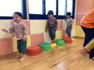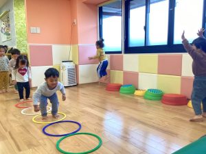 りんご組さんはフープを目印にして両足ジャンプに挑戦💪