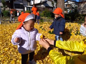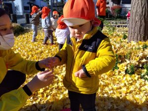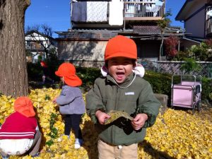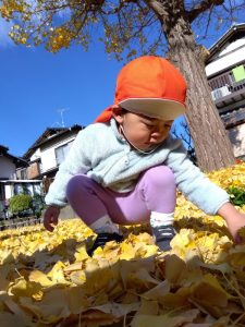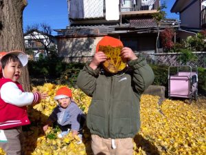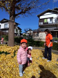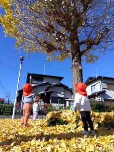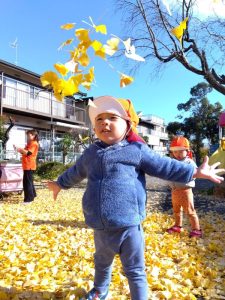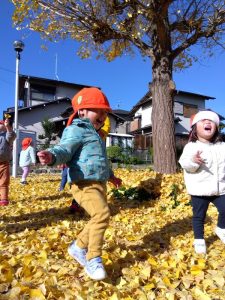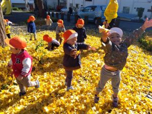 両手で落ち葉をひろい、お空に舞いあげて黄色の雨を降らせました🙌