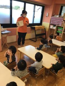 絵本が始まると「はしれー」の元気なフレーズと勢いのある絵にワクワクしている様子が見えて来ました。最初はじっくり聞いていた子どもたちも走っている登場人物が増えてくるにつれて少しソワソワと身体を動かしているくらい物語に入り込んでいました😄