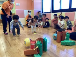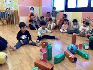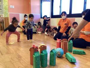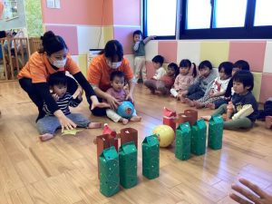 小さいお友だちは座って保育士と一緒にボールをコロコロ➿🟡