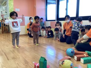 りんご組さんは立って、少し距離をとって挑戦💪