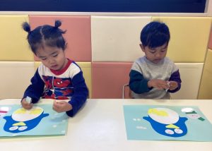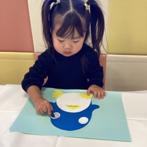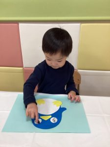 まずはペンギンの目や口、足をのりで貼ります🌼