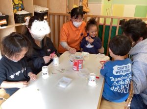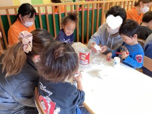 「かいてあげる!」と保護者の方の紙コップにもお絵描きをしてあげたり、
