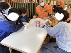 最初はなかなかカップの中に玉が入らずに苦戦する子どもたち💦