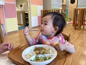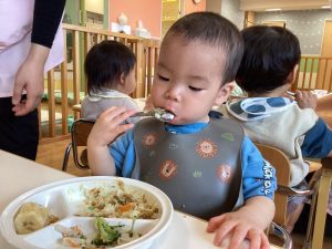 こぼしながらも、スプーンをもって「自分でたべる」姿が素晴らしいです👏