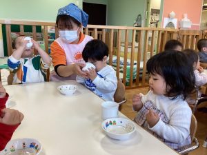 もも組さんも保育士に手伝ってもらいながらも、