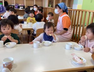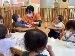 この日はおせんべいで、手にもって口に運ぶ子どもたち😋