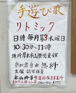 山際児童館では手遊び歌やリトミックを毎月第三水曜日に開催しております。リトミックにお子様が乗り気でなくても児童館の庭で遊んだり、リトミックの前などにおもちゃで遊ばせてもらえることも出来るのでお子様の気持ちに合わせて参加出来ると思いますヨ🎶