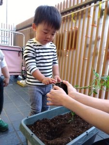 保育士と一緒に苗を優しく持って☺️