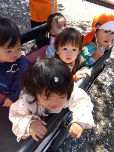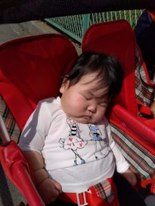ぽかぽかのお日様を浴びて、バギーではもも組さんがスヤスヤ😴