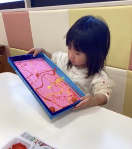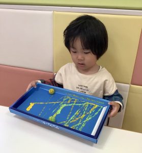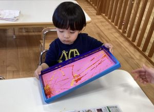 りんご組さんは絵の具のついたビー玉を転がして模様を描いてみました🌈