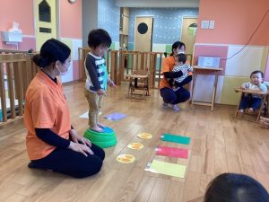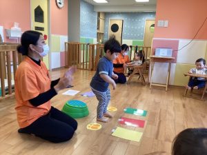 保育士の言った色のカードの前にジャンプをしました👣
