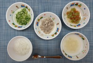 (写真は後期食です。月齢によって形、固さ、盛り付け量を変えて提供しています。)