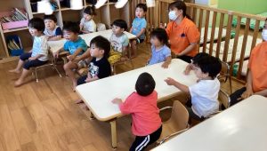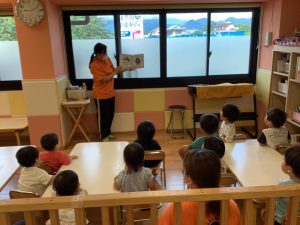 夏になると室内と適度な戸外で過ごせる水族館はとてもいい場所ですよね。子どもたちが絵本でその場所を知って実際に行ってみたりテレビで水族館を見たりして胸を躍らせてる姿が目に浮かんでくる絵本の時間となりました🎶