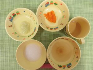 (写真は離乳食後期です。年齢によって形、固さ、盛り付け量を変えて、提供しています。)