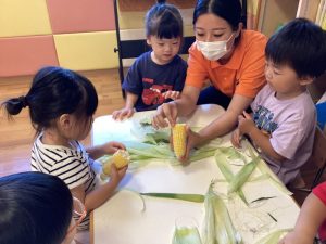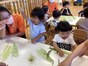 皮をむいたとうもろこしを調理の先生にバトンタッチ⭐️