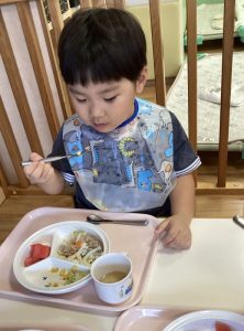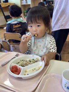 手やスプーンで自分で食べる子どもたち😋