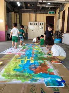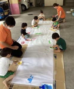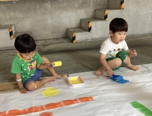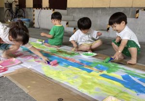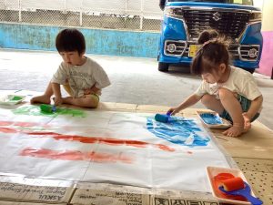 今回はローラーやハケ、筆などの道具をつかって模造紙に色を塗りました🌱