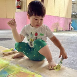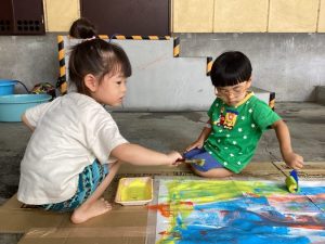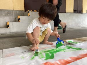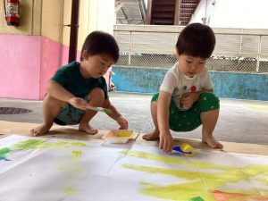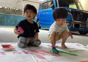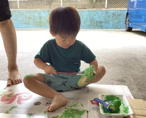 手が汚れることが苦手なお友だちも一緒に絵の具遊びができ