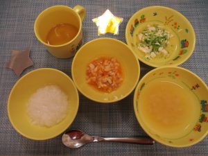 (写真は中期食です。離乳食は、離乳食の段階ごと固さ、切り方、量を変えて提供しています。)